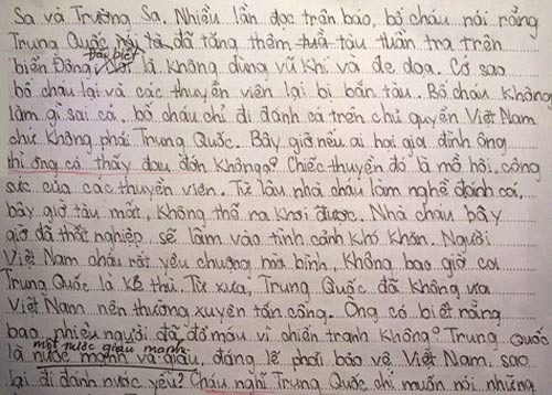 Nhiều lần đọc trên báo, bố cháu kể rằng Trung Quốc đã tăng thêm tàu tuần tra trên Biển Đông, đặc biệt là đã dùng vũ khí và đe dọa. Cớ sao bố cháu và các chú bác làm trên tàu lại bị đe dọa, sao tàu của bố cháu lại bị bắn cháy, thưa ông? Bố cháu không làm gì sai cả, bố cháu chỉ đi đánh cá trên biển chủ quyền của Việt Nam chứ không phải Trung Quốc. Bây giờ có ai hại gia đình ông thì ông có thấy đau đớn không ạ?".