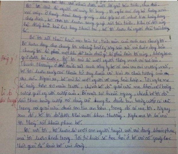 Học sinh này viết: “Tôi nghe mẹ tôi kể hơn 20 năm trước chính bố đã giải cứu mẹ khỏi một bang cướp giết người cướp của. Bố mặc sự hiểm nguy chính mình đã lần theo bang cướp và dùng võ Kungfu đánh tan bang cướp có vũ trang và giải cứu đám con tin an toàn…"