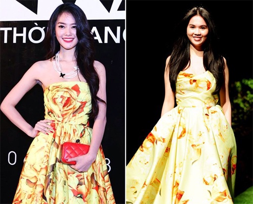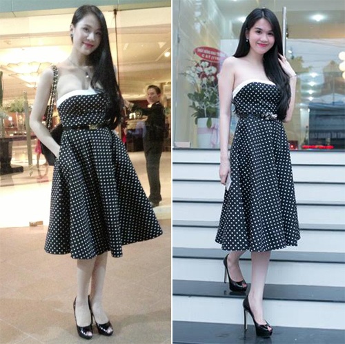 | Hay Linh Chi và Ngọc Trinh lựa chọn cùng một mẫu váy nhưng khác màu. |