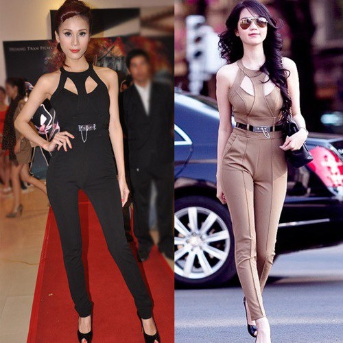 | Hai người đẹp đụng độ bộ jumsuit cut out với 2 phiên bản màu khác nhau. Ngay cả cách chọn giày của Thái Hà và Ngọc Trinh cũng giống nhau 100%. |