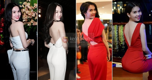 "Kho" jumpsuit của Ngọc Trinh cũng "đồ sộ" chẳng kém, thậm chí là có phần nhỉnh hơn Angela Phương Trinh. Hiếm sao nữ nào thích jumpsuit với điểm chung là thiết kế đơn sắc, ống suông và khoét lưng như Angela Phương Trinh và Ngọc Trinh. Đặc biệt, khi tạo dáng chụp hình, dường như cả hai đều có kiểu tạo dáng giống hệt nhau, quay lưng “hất mông vào máy ảnh” để khoe lưng trần, cùng vòng 3 sexy.
