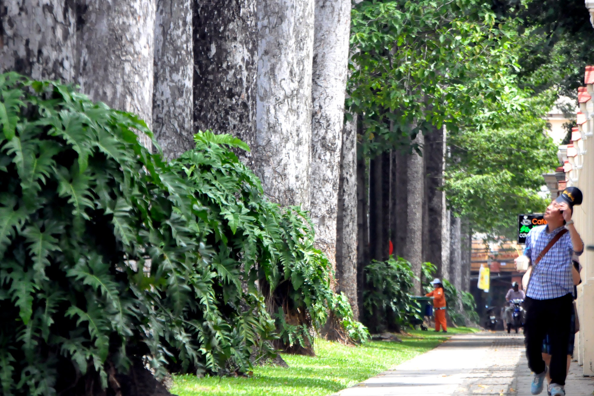 | Khách du lịch ngước nhìn những hàng cây dầu cổ thụ có tuổi đời trăm năm trên đường Huyền Trân Công Chúa, quận 1. |