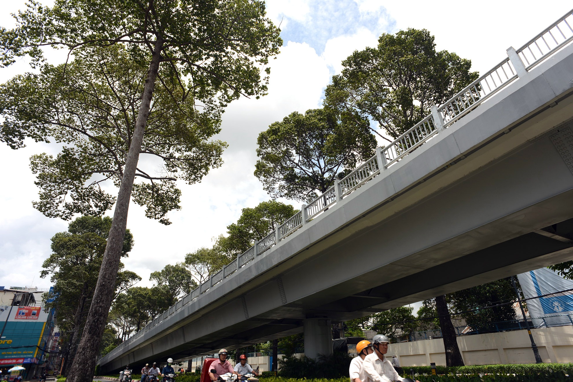 | Sự kết hợp mềm mại giữa hàng dầu cao lớn, rợp bóng với cây cầu vượt thép tại giao lộ Nguyễn Tri Phương-3/2-Lý Thái Tổ. |