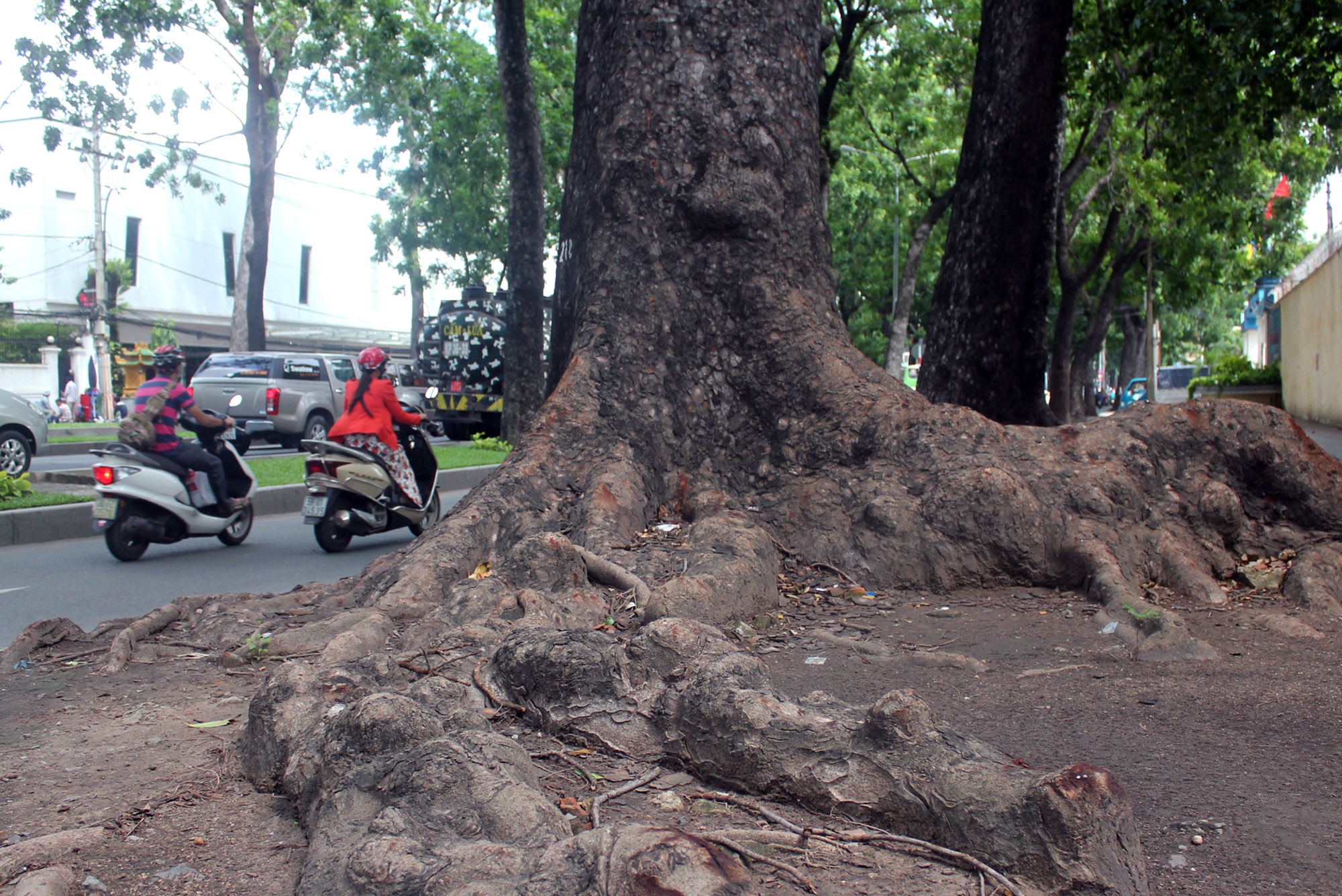 | Những cây xà cừ cổ thụ trên đường Tôn Đức Thắng, đường 3/2,... có đường kính gần 2m với bộ rễ to khỏe trồi lên mặt đất. |
