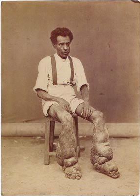 | Vì quá đau khổ về dáng vẻ của bản thân, người đàn ông mắc bệnh chân voi trong ảnh từng muốn cắt cụt đôi chân. Một cuộc phẫu thuật gỡ bỏ nhiều mô dư thừa trên đôi chân của ông diễn ra thành công. Tuy nhiên, ông qua đời 5 tháng sau ca mổ. |