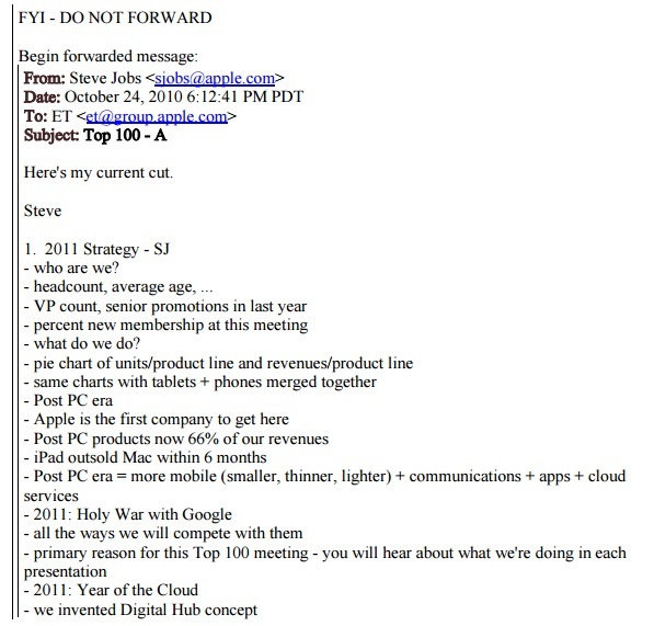 Có lẽ, không quá bất ngờ khi Jobs coi Google là mối đe dọa hàng đầu. Trong một email hồi 10/2010, cựu CEO Apple từng nhắc rằng: 2011 sẽ giống như là một cuộc “thánh chiến với Google”. Đáng chú ý hơn, 6 tháng sau khi bức thư được gửi đi, Apple đã tiến hành kiện Samsung, nhà sản xuất điện thoại Android lớn nhất thế giới.