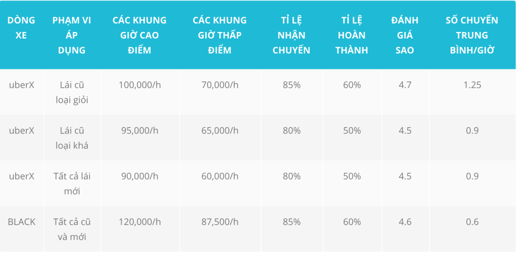 Để được hỗ trợ, các tài xế Uber phải đạt đủ 5 chỉ tiêu: số chuyến chạy trung bình 1,2-1,25 chuyến/giờ, tỷ lệ nhận khách 85%, tỷ lệ hoàn thành chuyến 60%, điểm chất lượng do khách đánh giá đạt gần 5 sao và số giờ online trực tuyến phải tương đương số lượng chuyến phục vụ mỗi ngày.