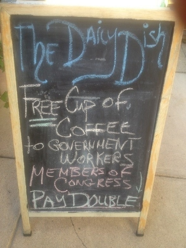 | 2. "Cà phê miễn phí cho công chức chính phủ, còn nghị sĩ sẽ phải trả gấp đôi" - Thông điệp rất hài hước từ một cửa hàng cà phê. |
