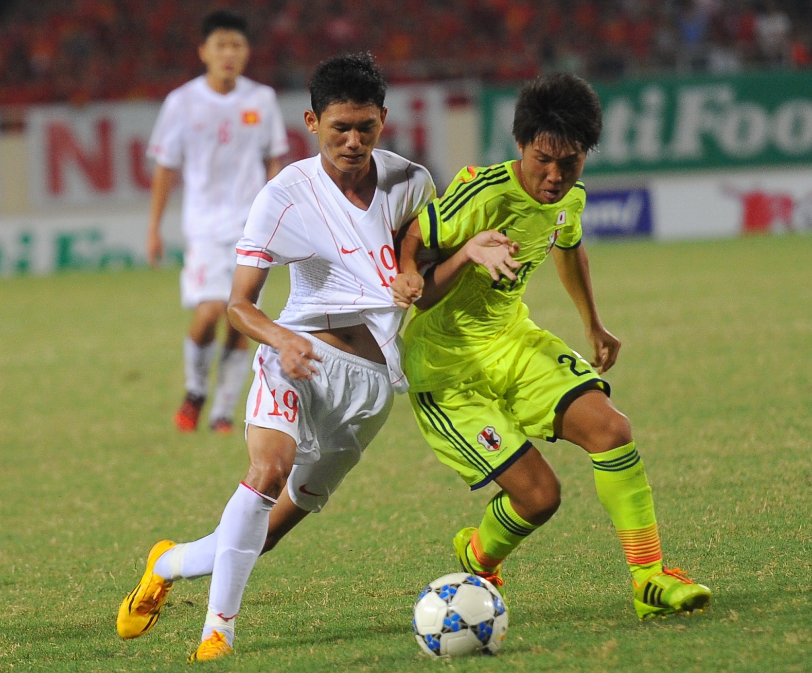 | Hồng Duy (số 7) tuy chơi ở vị trí hậu vệ nhưng thường xuyên tham gia các tình huống dâng cao hỗ trợ tấn công của U19 Việt Nam. |