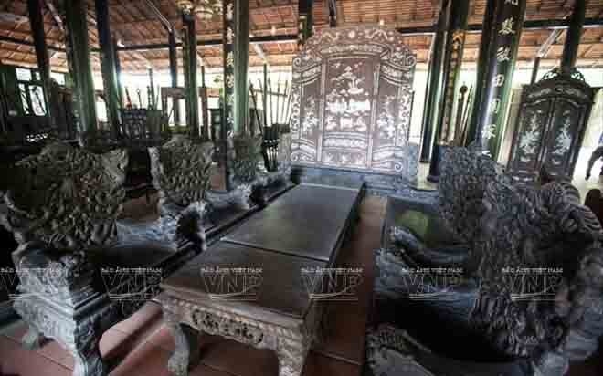 | Bộ bàn ghế khảm rồng có niên đại hàng trăm năm trưng bày ở làng cổ Phước Lộc Thọ, tỉnh Long An. |