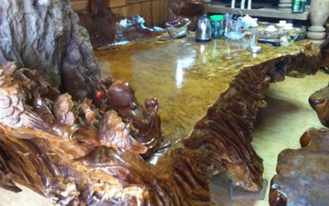 | Bộ bàn ghế quý hiếm với chiếc bàn dài được làm bằng cả súc gỗ nguyên. |