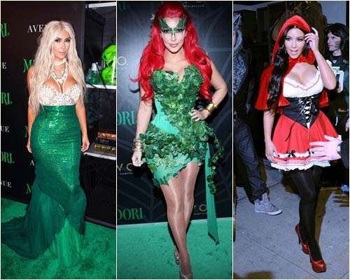| Kim Kardashian sở hữu khá khá trang phục Halloween sexy. Trong 3 năm trở lại đây, Kim đòn Halloween trong trang phục nàng tiên cá, cô bé quàng khăn đỏ và Poison Ivy. |