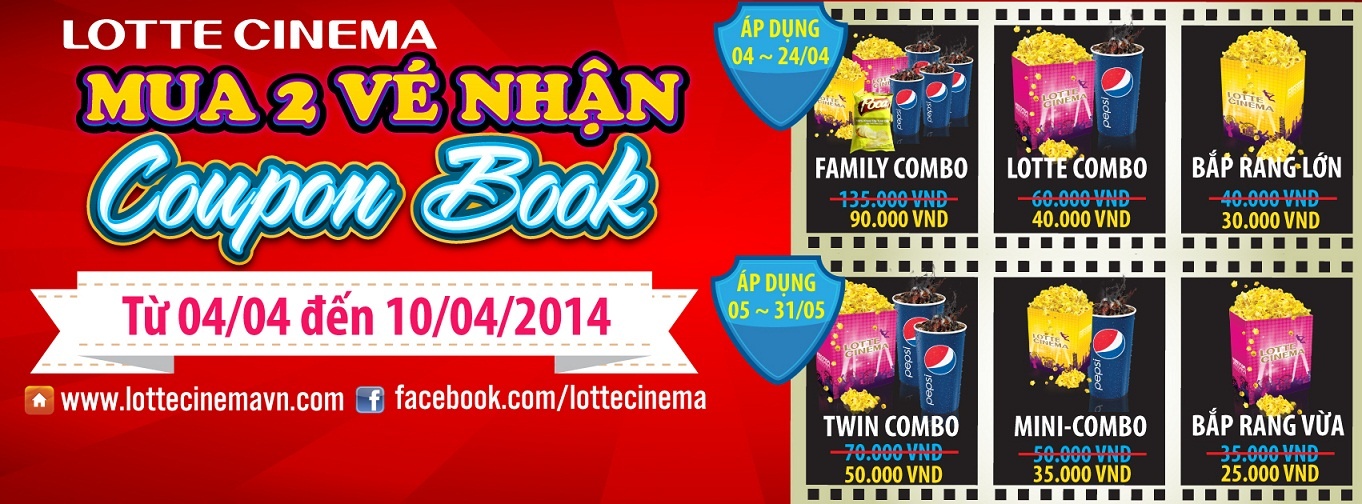 Lotte Cinema cũng không quên ưu đãi cho các sản phẩm đi kèm như bắp (bỏng ngô) và nước uống để các bạn có thể thoải mái thưởng thức điện ảnh trọn vẹn. Đó là chương trình tặng coupon book với các phần ăn được giảm giá tới 30%. Các phần coupon book này được phát cho các bạn khi mua 2 vé phim bất kỳ từ 4/4 tới 10/4 và có thời hạn sử dụng tới 31/5.