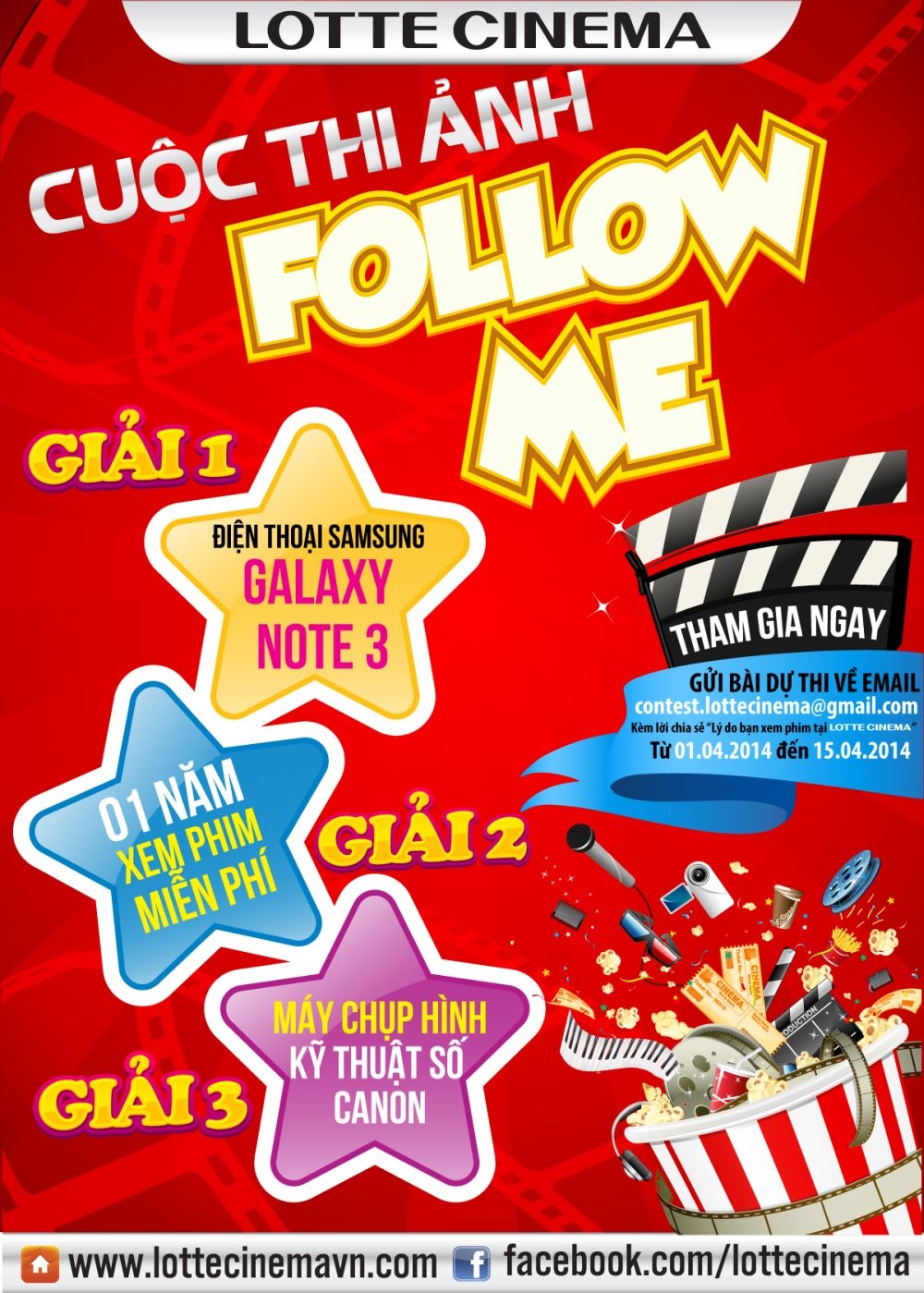 Từ 1-15/4, Lotte Cinema tổ chức một cuộc thi ảnh Follow Me - Theo tớ đi khắp Lotte Cinema. Cách tham dự đơn giản: các bạn chụp một tấm hình tại Lotte Cinema hoặc tại tòa nhà có Lotte Cinema trong đó, sau đó gửi về email contest.lottecinema@gmail.com kèm theo thông tin liên hệ. Lotte Cinema sẽ đăng tải ảnh của bạn lên Facebook và các bạn có thể thoải mái chia sẻ với bạn bè trên mạng xã hội. Hình ảnh chụp cần theo phong cách “tay nắm tay” và nhìn thấy rõ khuôn mặt của bạn tham dự.
