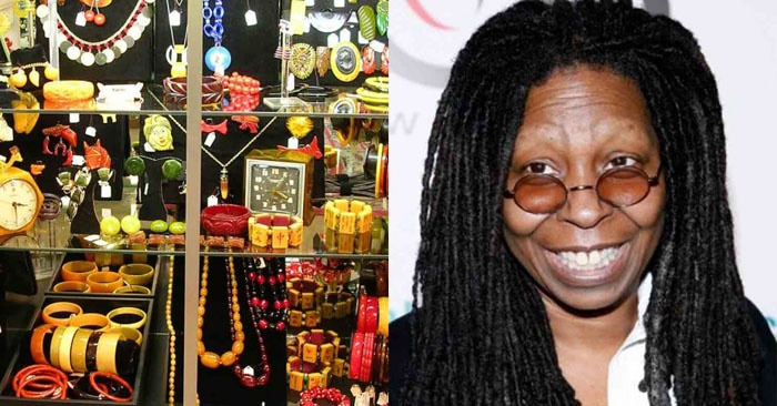 7. Whoopi Goldberg - Trang sức bằng nhựa Trong những năm 1970, Bakelite (một loại nhựa) trở nên phổ biến như một loại vật liệu làm đồ chơi, các nút bấm, đồ gia dụng và thậm chí cả đồ trang sức. Loại nhựa này thực sự tạo ra một cơn sốt lúc bấy giờ, và cũng là lý do khiến Goldberg thích thu thập những món đồ trang sức làm từ nó. Cô đã đeo các đồ trang sức Bakelite đến nhiều sự kiện lớn, thậm chí trong cả lễ trao giải Oscar. Không chỉ Goldberg, cả Barbra Streisand, Diane Keaton và Lily Tomlin cũng có sở thích này. |