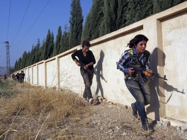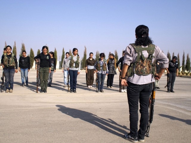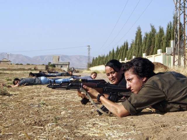 Các bông hồng người Kurd chuẩn bị tập bắn. Người Kurd chiếm 10% dân số Syria. Họ muốn thành lập một khu tự trị riêng. Ảnh: AFP.