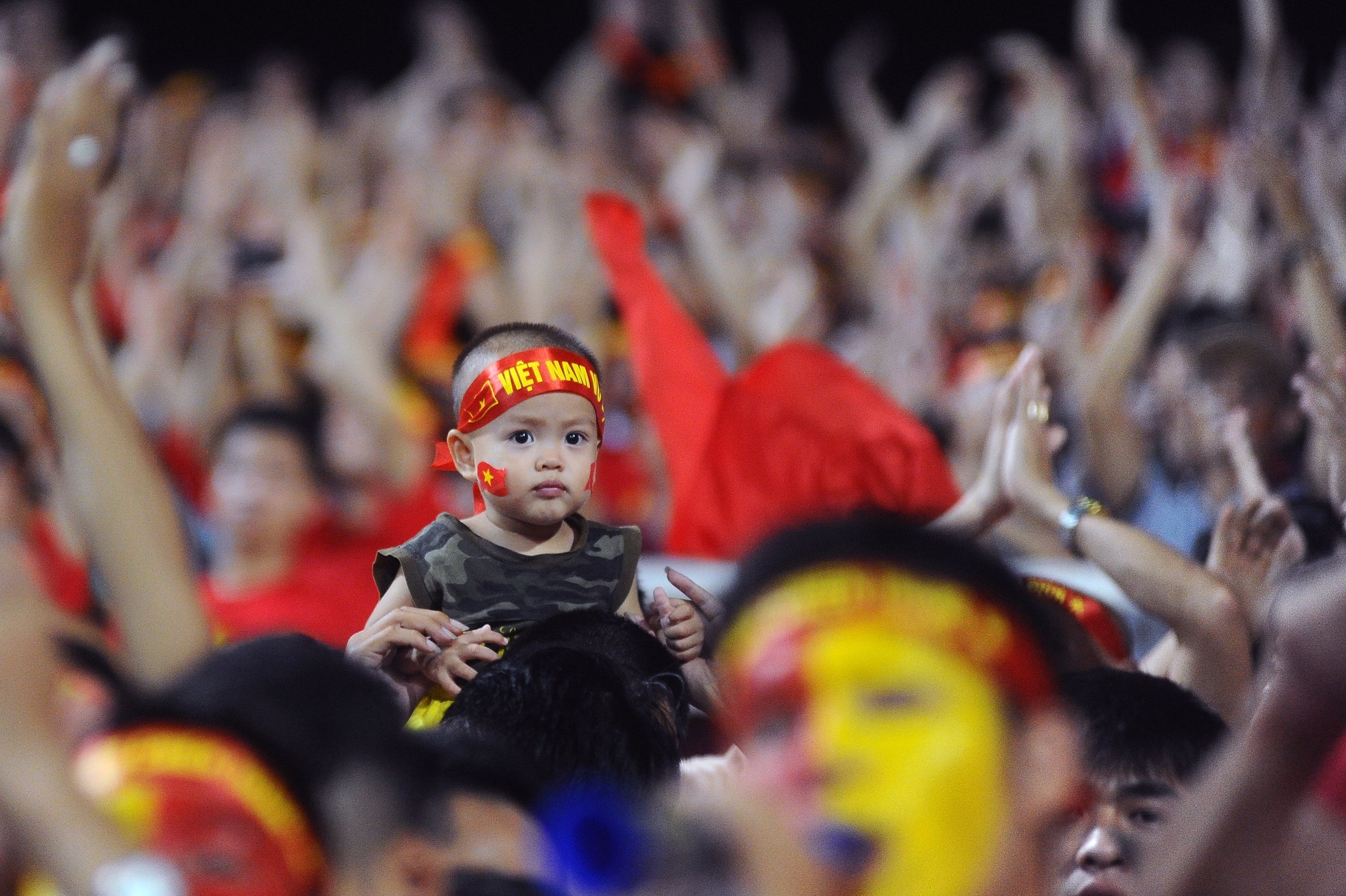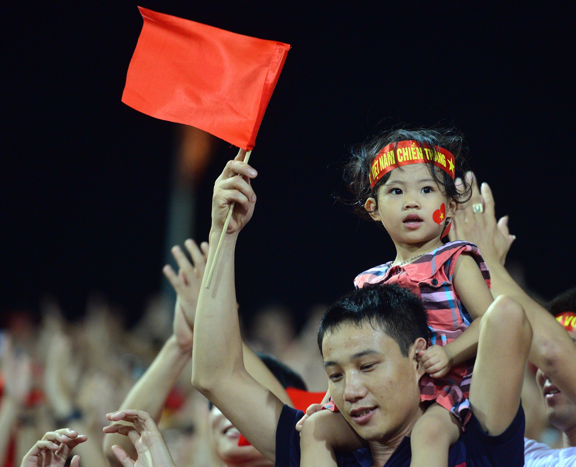 | Những em nhỏ còn chưa hiểu bóng đá là gì cũng được bố mẹ cho tới sân cổ vũ các anh. Ảnh: Hoàng Hà. |
