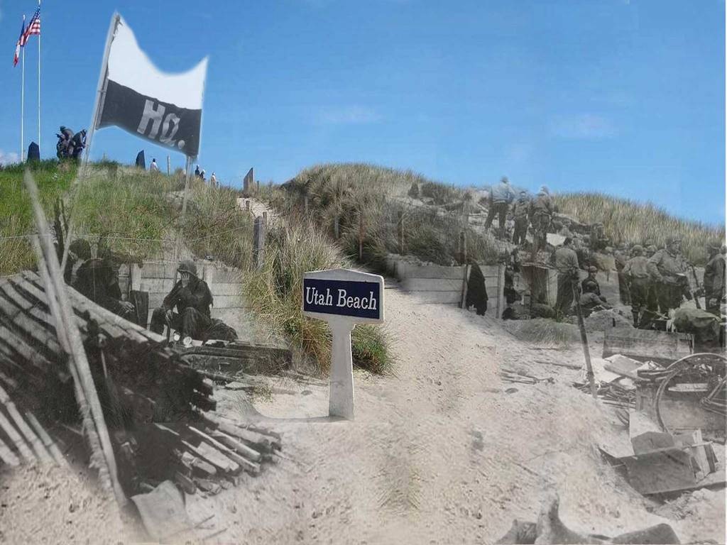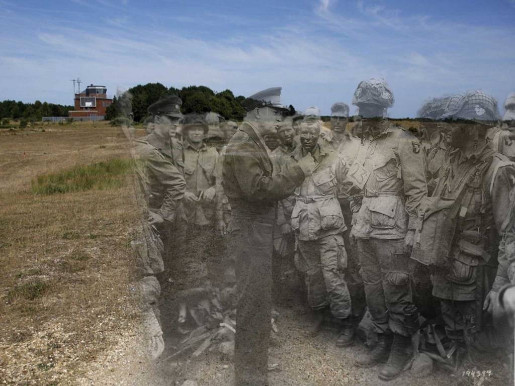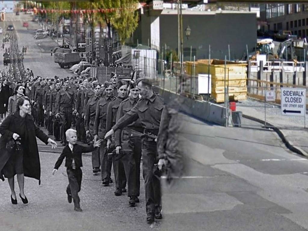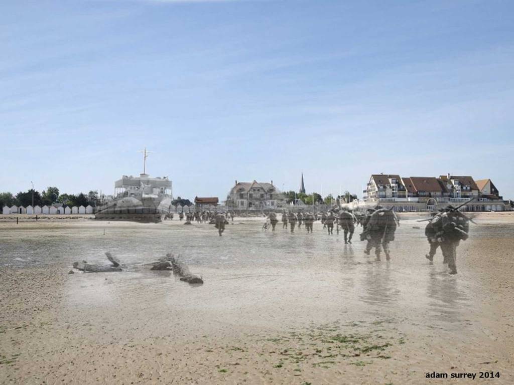 Quân đội Canada hành quân dọc bờ biển Juno khi thủy triều rút trong cuộc đổ bộ D-Day năm 1944 kết hợp với khung cảnh hiện tại.