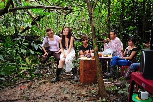 | Bữa ăn đúng chất dã chiến giữa rừng của Vy Oanh và ê-kíp quay MV. |