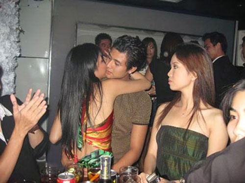 Tương tự Ngọc Trinh, hoa hậu Thùy Lâm cũng bị dính án “thác loạn tại vũ trường”. Sự thật đó là một buổi tiệc sinh nhật của ông bầu Khắc Tiệp của Ngọc Trinh. Trong ảnh, cô có hành động "buông thả" khi ở bên bạn (lúc đó) là Vĩnh Thụy.