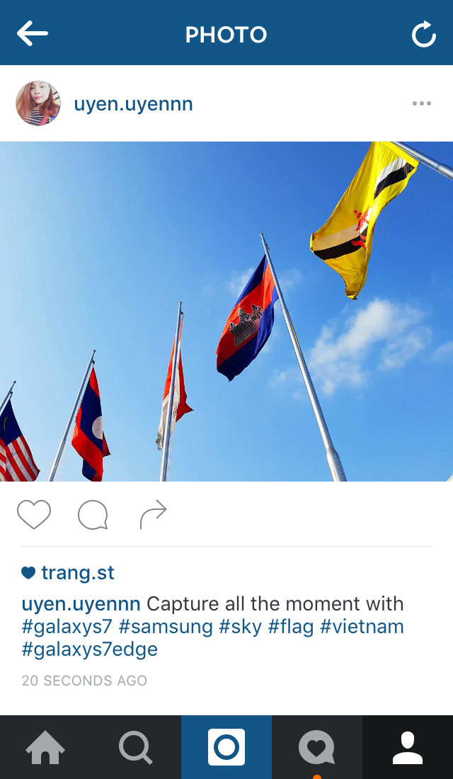 Khả năng bắt cứng chủ thể của công nghệ Dual Pixel được thể hiện qua bức ảnh đẹp của người dùng uyen.uyenn. Người xem có thể thấy chuyển động của các lá cờ gần như đứng yên. Ngoài ra khả năng tái tạo màu bầu trời của Galaxy S7 rất tốt. |