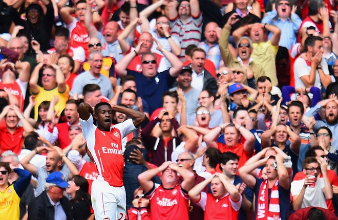 | Tiền đạo Danny Welbeck tỏ ra rất tiếc nuối sau khi bỏ lỡ cơ hội. Trong khi sau lưng anh, fan Arsenal cũng có phản ứng tương tự. |