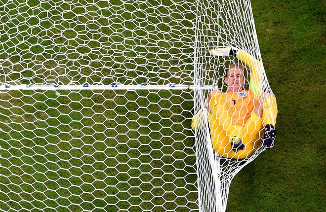 | Thủ môn Joe Hart bay vào lưới sau bàn thắng của đồng đội cũ Mario Balotelli ghi trong trận đấu giữa Anh và Italy tại World Cup 2014. |