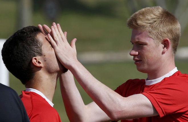 | Các tuyển thủ Bỉ bôi kem dưỡng da cho nhau. |