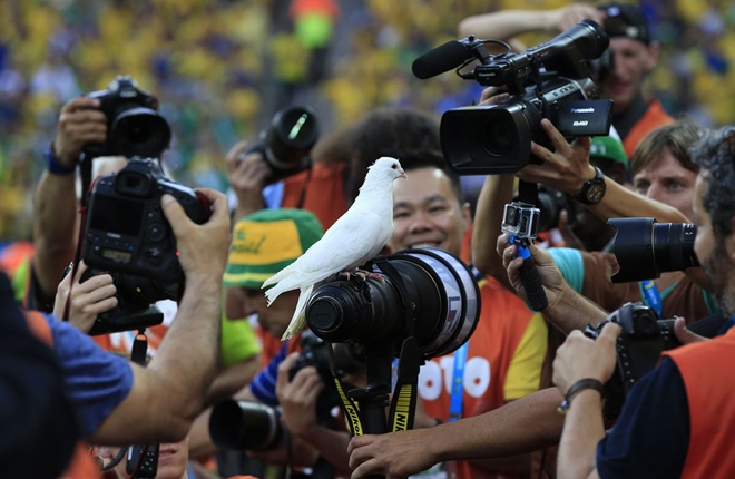 | Trong trận khai màn World Cup giữa Brazil và Croatia, các phóng viên đã ngó lơ cầu thủ hai đội để tập trung chụp hình chú chim câu. |