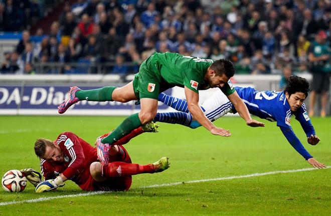 | Tiền đạo Raul Bobadilla Augsburg và hậu vệ Atsuto Uchida của Schalke có cú ngã lộn người như đã tập sẵn. |
