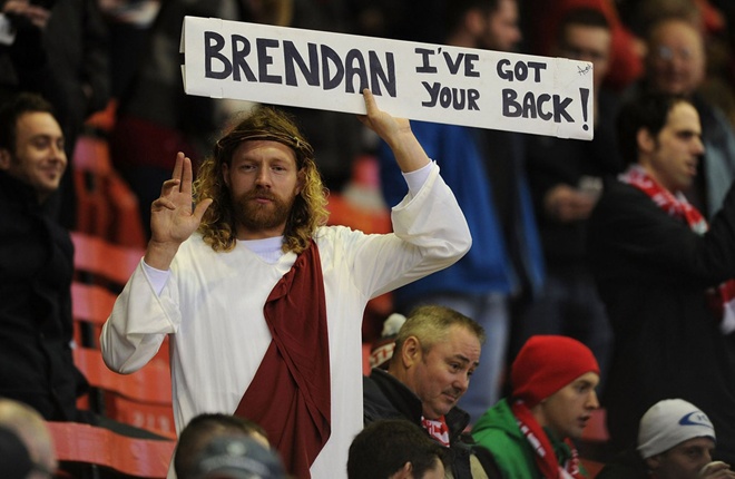 | Một fan Liverpool đóng giả Đức Chúa bày tỏ sự ủng hộ đối với HLV Brendan Rodgers bất chấp phong độ nghèo nàn của The Kop tại giải năm nay. |