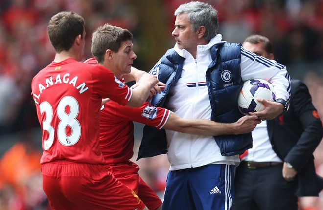 | Đội trưởng Steven Gerrard và John Flanagan giành bóng với HLV Jose Mourinho trong trận đấu giữa Liverpool và Chelsea. |