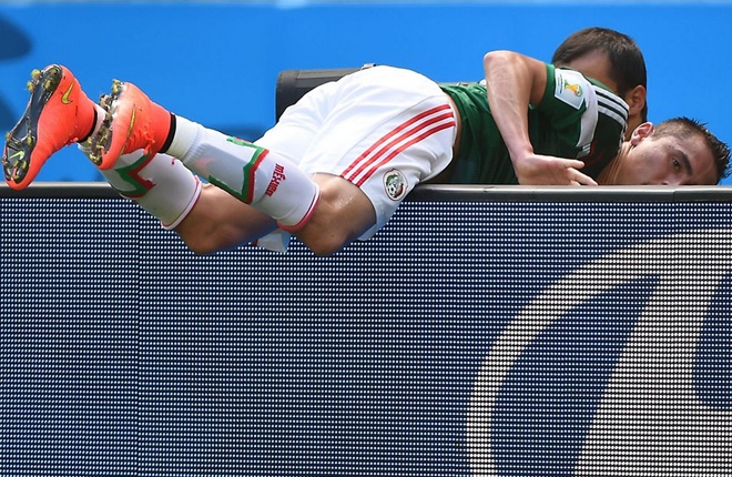 | Hậu vệ Paul Aguilar ngã ra khỏi biển quảng cáo khi tham dự World Cup tại Brazil. |