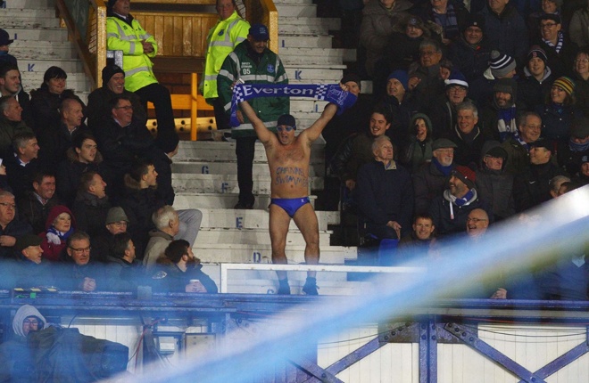 | Một CĐV của Everton mặc đồ bơi tới sân để cổ vũ cho đội bóng con cưng bất chấp thời tiết lạnh giá tại nước Anh. |