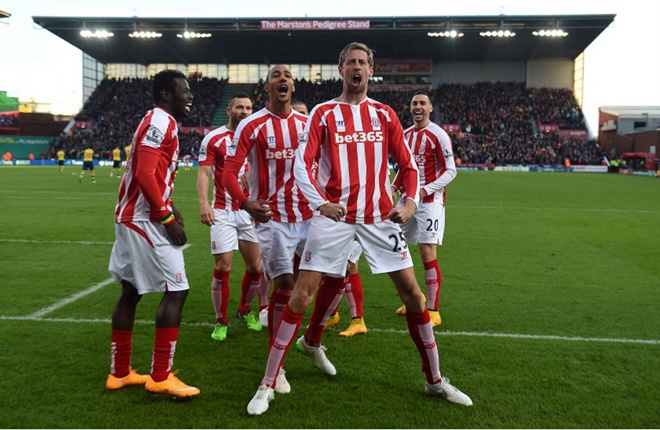 | Tiền đạo Peter Crouch của Stoke City bắt chước kiểu ăn mừng của Ronaldo sau khi ghi bàn vào lưới Arsenal. Tuy nhiên, trông dáng cò sếu của Crouch khiến nhiều người phải bật cười. |