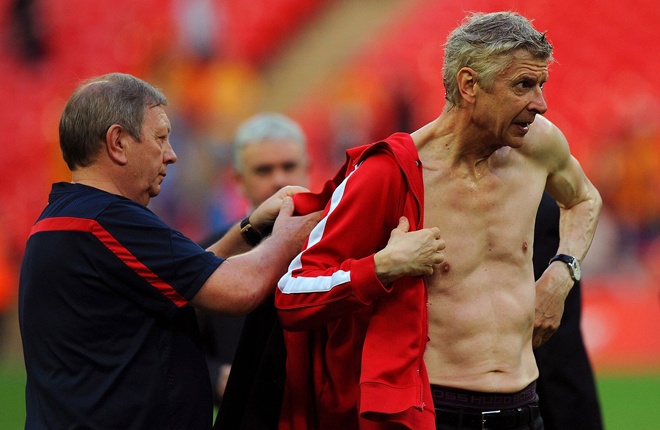 | HLV Arsene Wenger thay áo vì bị các cầu thủ dội bia vào người sau trận chung kết FA Cup khép lại. Trông chiến lược gia người Pháp như chuẩn bị thượng đài trong một trận đấu boxing. |