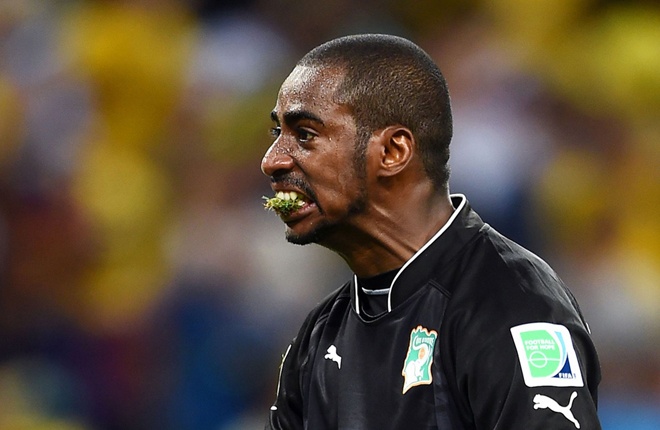| Thủ thành Boubacar Barry của đội tuyển Bờ Biển Ngà ăn mừng bàn thắng tại World Cup 2014 bằng cách gặm cỏ. |