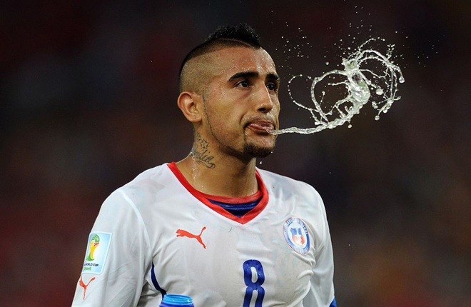| Tiền vệ Arturo Vidal của Chile phì nước trông giống hình một con tôm trong trận đấu với Tây Ban Nha tại World Cup 2014. |