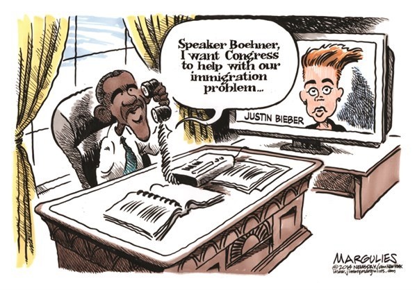 | Ảnh biếm họa với nội dung Nhà Trắng đang xem xét việc có nên chấp nhận một công dân nhập cư vô lề lối như Justin ở lại Mỹ. |
