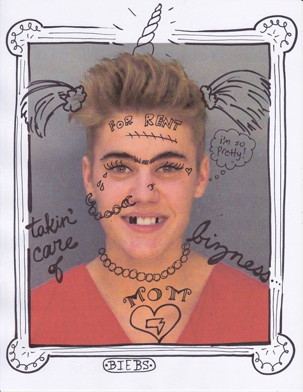 | Chân dung Justin Bieber mỉm cười khi bị bắt giam vì đua xe bị mang ra vẽ nguệch ngoạc, châm biếm. |