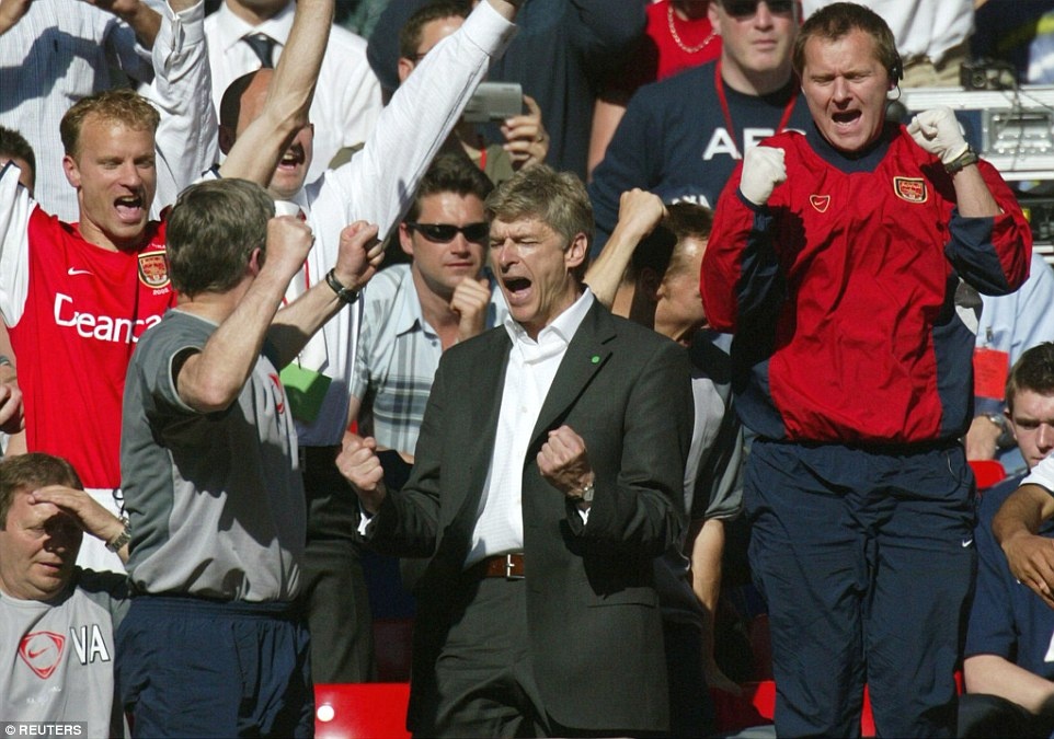 | Wenger cùng các học trò Robert Pires, Thiery Henry và Dennis Bergkamp vẫy tay chào các CĐV sau khi Arsenal giành cú đúp (Premier League và FA Cup) ở mùa giải 2001/02. |