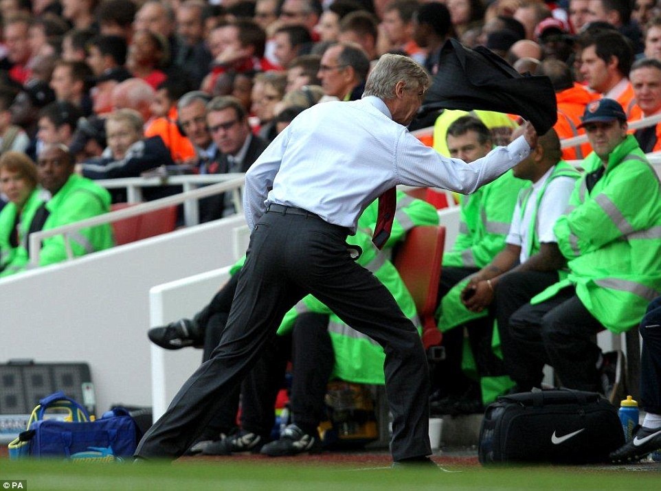 | Một trong những khoảnh khắc hiếm hoi, Wenger bị trọng tài truất quyền chỉ đạo ở cuộc so tài với M.U tại Old Trafford vào 8/2009. |