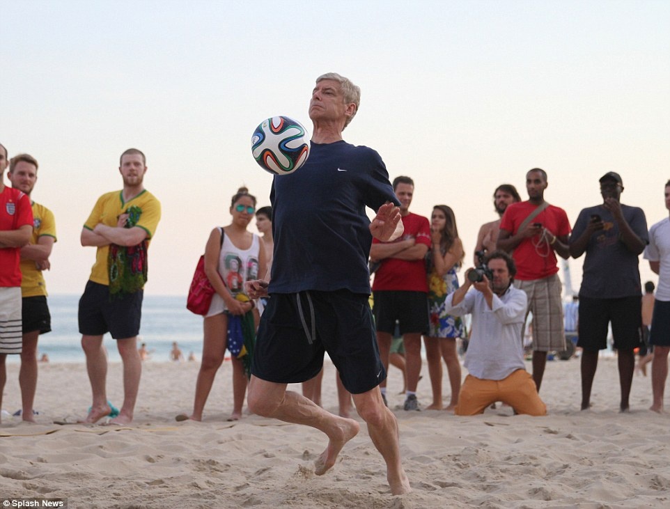 | Wenger trổ tài tâng bóng tại VCK World Cup 2014, nơi ông đảm nhiệm vai trò bình luận viên bóng đá cho một đài truyền hình của Pháp. |