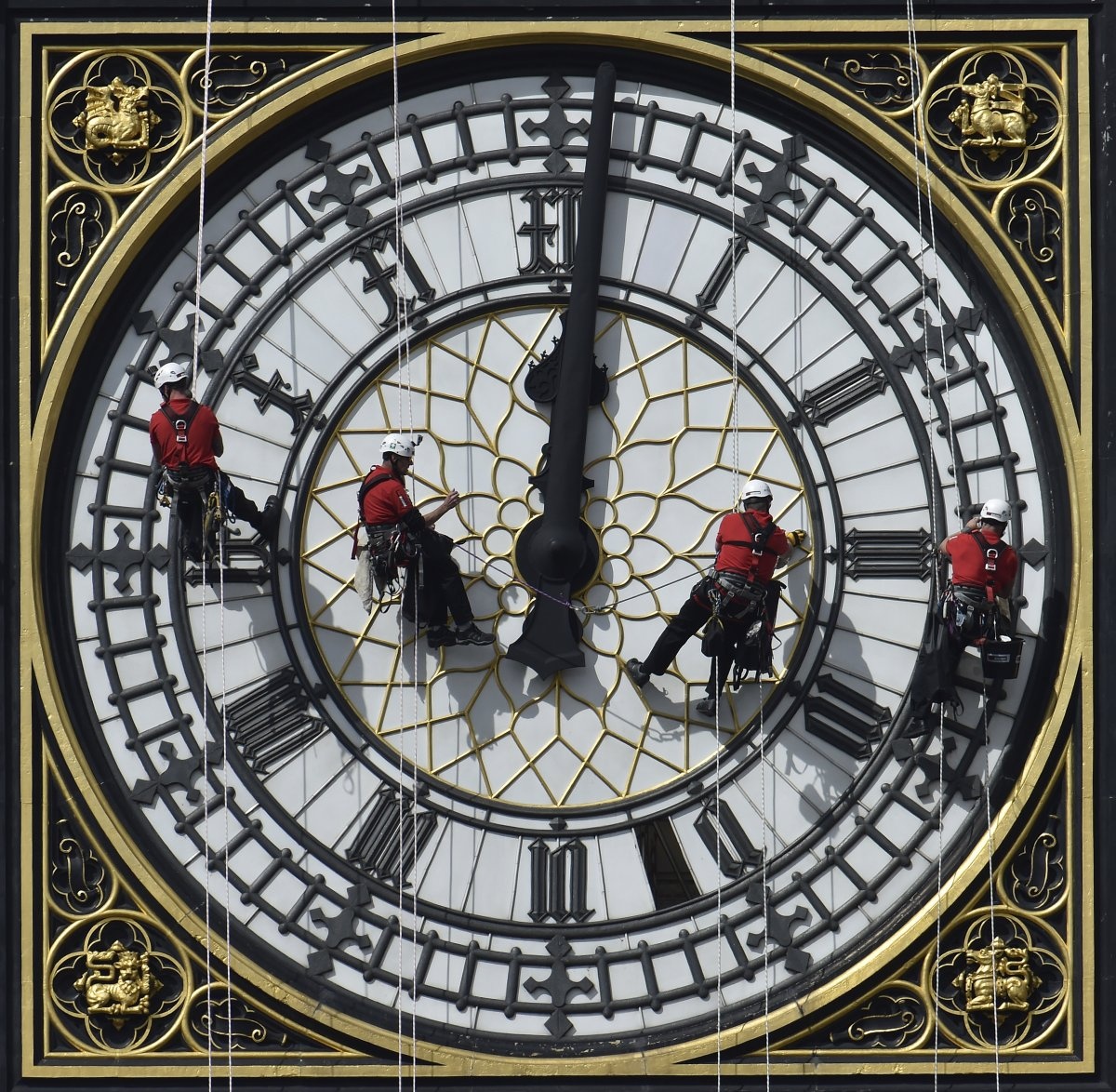 Để đánh bóng chiếc đồng hồ Big Ben, các công nhân phải treo mình lơ lửng từ trên tòa nhà Quốc hội, trung tâm thành phố London, Anh ngày 19/8/2014. Họ cần một tuần để làm sạch chiếc đồng hồ lớn bậc nhất thế giới này.