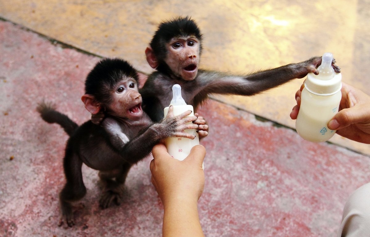 Hai con khỉ đầu chó giành phần sữa từ tay một người nuôi thú tại vườn thú Hàng Châu, tỉnh Chiết Giang, Trung Quốc ngày 17/9/2014.