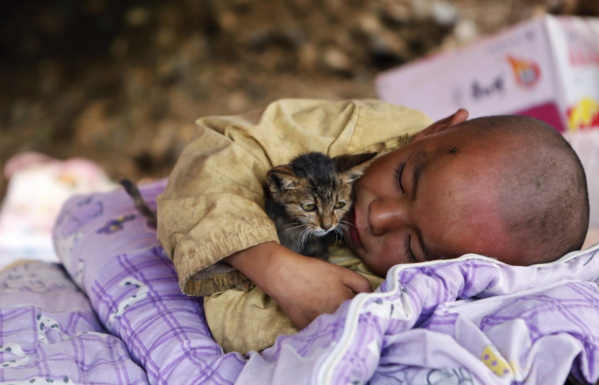 Bé trai ôm một con mèo trong tay và nằm ngủ dưới một khu trú ẩn tạm tại khu vực động đất ở huyện Lỗ Điện, Vân Nam, Trung Quốc ngày 5/8/2014. Trận động đất đã khiến hơn 600 người thiệt mạng, truyền thông Trung Quốc đưa tin.