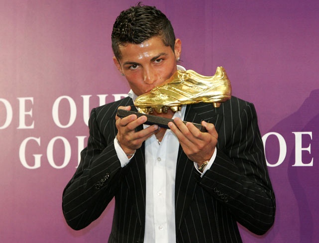 | Ronaldo vỡ òa hạnh phúc và hôn lên Chiếc giày vàng 2008 danh giá vừa được trao. |