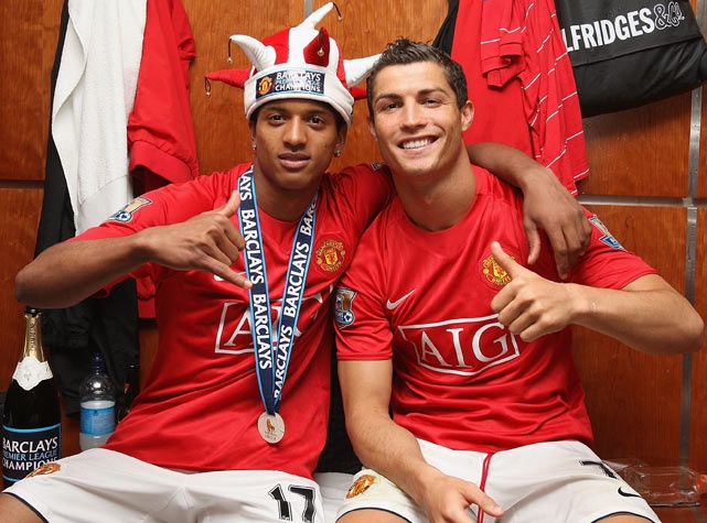 Ronaldo ăn mừng cùng đồng đội Nani trong phòng thay đồ. |