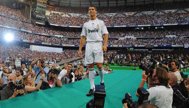 | Năm 2009, Ronaldo chính thức khoác áo Real Madrid với bản hợp đồng "bom tấn" trị giá 94 triệu euro. Anh hãnh diện ra mắt người hâm mộ trên sân Bernabeu. |