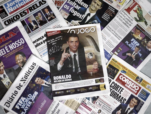 | Hình ảnh Ronaldo nhận giải Cầu thủ xuất sắc nhất thế giới 2008 tràn ngập trên các mặt báo. |